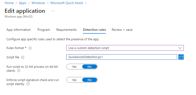 The script simply uses Get-AppxPackage to validate that the Windows Store version of Quick assist is now installed. Below is a screenshot of what the detection rules page should look like.